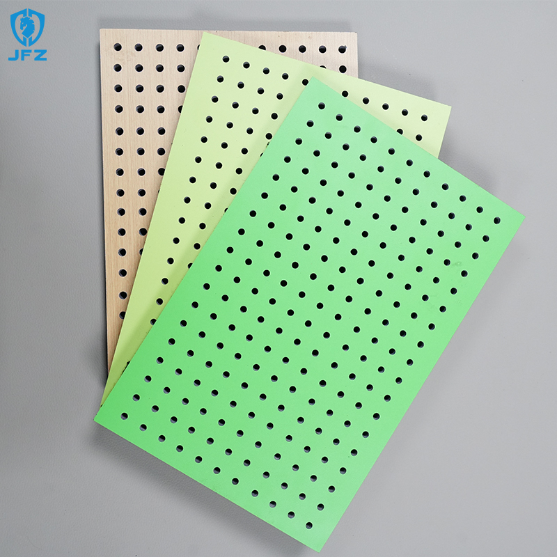 The perforated gypsum board has cylindrical holes that run through the front and back of the gypsum board. A breathable backing material and a sound-absorbing material that can absorb incoming and outgoing sound energy are pasted on the back of the gypsum board to form a platform. The sound absorption mechanism is that there are a large number of tiny interconnected pores inside the material, and sound waves can penetrate deep into the material along these pores, generating friction with the material to convert sound energy into heat energy. The sound absorption characteristics of porous sound-absorbing materials are that the sound absorption coefficient gradually increases with the increase of frequency, which means that low-frequency absorption is not as good as high-frequency absorption.