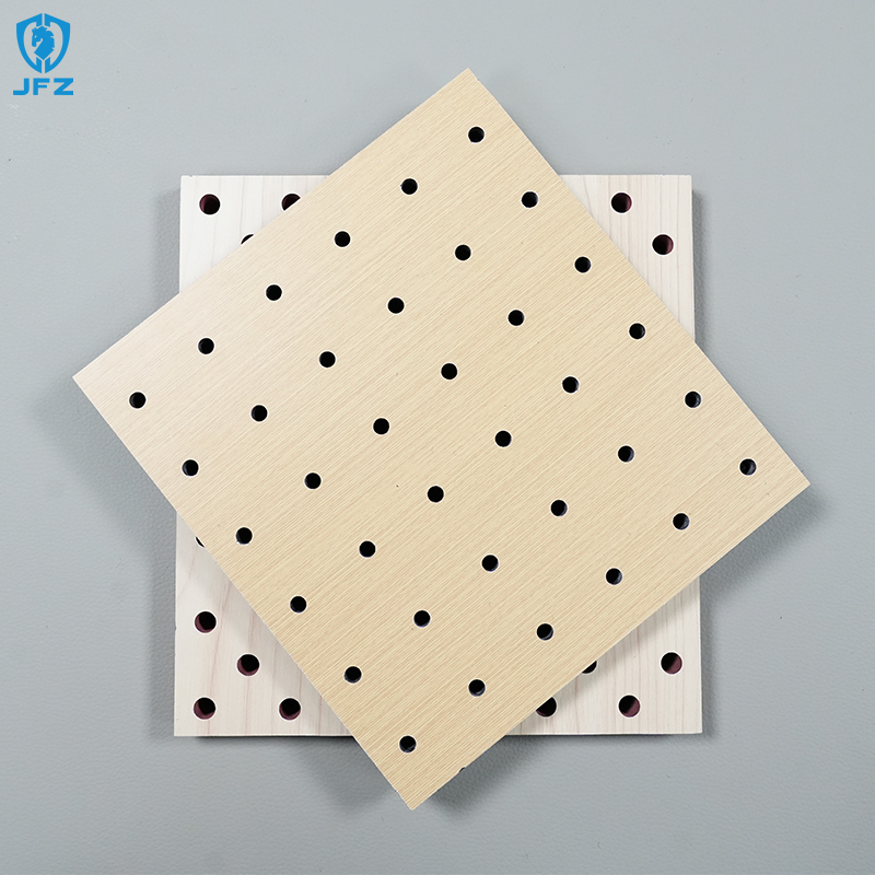 The perforated gypsum board has cylindrical holes that run through the front and back of the gypsum board. A breathable backing material and a sound-absorbing material that can absorb incoming and outgoing sound energy are pasted on the back of the gypsum board to form a platform. The sound absorption mechanism is that there are a large number of tiny interconnected pores inside the material, and sound waves can penetrate deep into the material along these pores, generating friction with the material to convert sound energy into heat energy. The sound absorption characteristics of porous sound-absorbing materials are that the sound absorption coefficient gradually increases with the increase of frequency, which means that low-frequency absorption is not as good as high-frequency absorption.